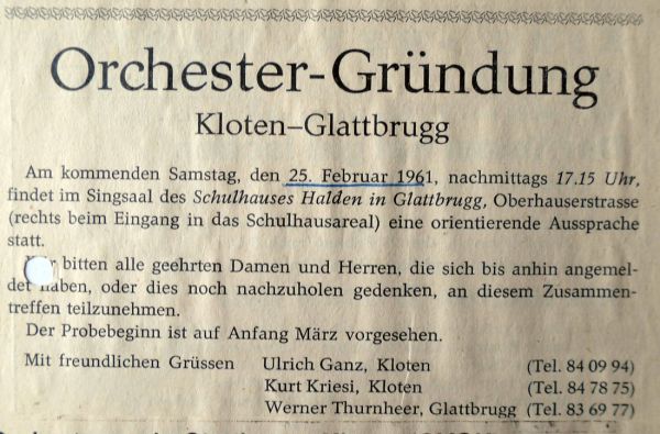 1961 gründete der initiative Amateurmusiker und Swissair-Ausbildner Ueli Ganz das Kammerorchester Kloten. Anfangs spielten vor allem viele Swissair-Angestellte, Luftverkehrsleiter und auch Lehrerinnen aus Kloten und Umgebung mit ihren Streich- und Blasinstrumenten im Orchester mit. Dank der regelmässigen, ambitionierten  Konzerten und beliebten Sommerserenaden gelang es dem Gründer und dem langjährigen Konzertmeister Edi Lang, das KOK zum festen Bestandteil des kulturellen Lebens von Kloten und Umgebung zu etablieren. Musikalische Schwerpunkte waren Aufführungen von Werken aus Barock, Vorklassik und Klassik, oft mit Wiederentdeckungen von wenig bekannten Komponisten.